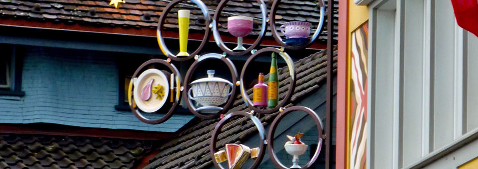 Colorful metal signs are crafted in shapes that indicate shops, restaurants, services, and studios of local craftsmen inside.