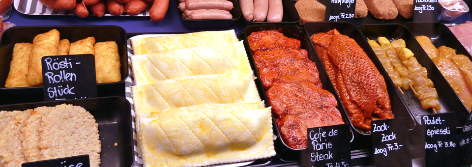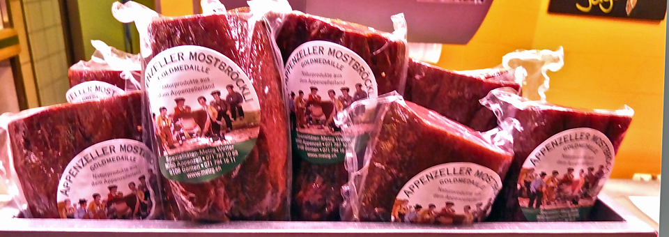 Appenzell is also known for its variety of sausages like alpenklubber, Südwooscht, Schüblig mit Speckwürful, and the ever-popular Mostbröckli , raw meat preserved in salt and seasoning, smoked and dried, all found at family-run Melzey Weller’s.