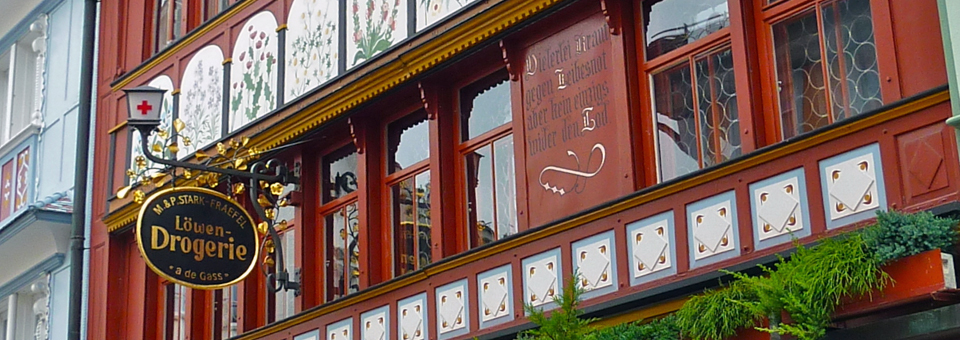 Löwen Pharmacy and other buildings are colorfully painted to indicate the products inside or perhaps a significant cultural or historical event.
