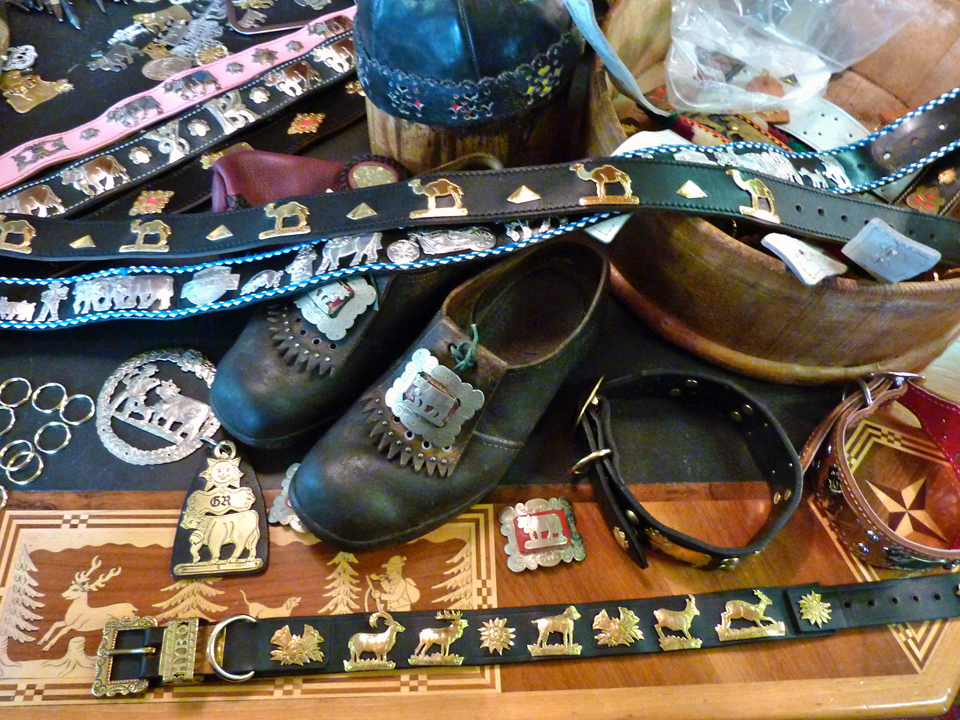 Huge cowbells on elaborately decorated straps hang in the window of Hampi Fässler ‘s shop. His other hand crafted metalwork products include traditional leather shoes belts and suspenders, hand crafted by this family for seven generations.
