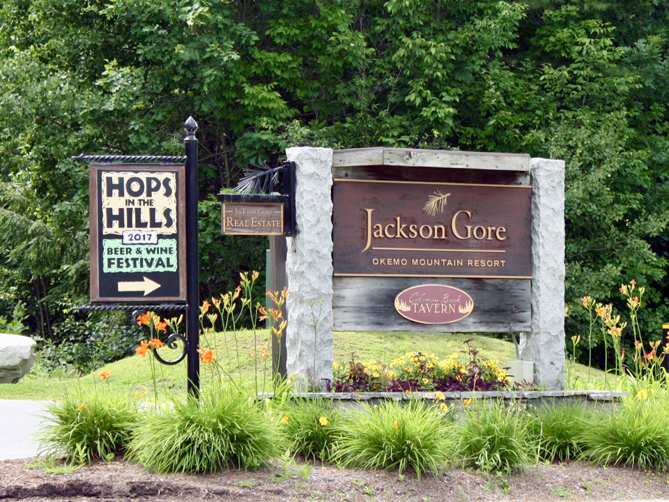Hops in the Hills signs, Jackson Gore Inn courtyard, Okemo Mountain Resort, Vermont