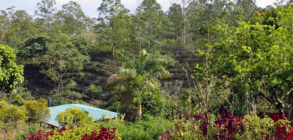 Neat rows of coffee plants flourish in the volcanic soil and abundance of sunlight and rain on the steep slopes. as we neared the Espirito Santo Coffee Plantation for our tour.