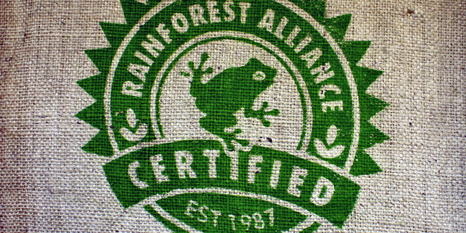 coffee bag with Rainforest Alliance logo, Espiritu Santo Coffee Plantation, Costa Rica