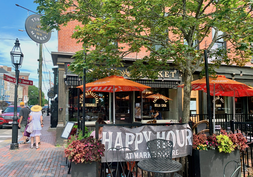 Book an outside table at Tuscan Market, an Italian restaurant on a busy corner at 14 Market Square. There’s much to see and to watch over lunch.