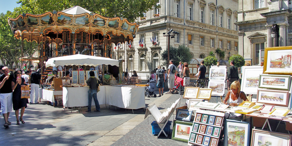 A large gold Madonna figure tops the Cathedral Notre-Dame-des-Doms, adjacent to the Papal Palace. Avignon has picturesque pedestrian areas, meandering medieval streets, shops surrounding the Place de l’Horloge, and a colorful carousel area. Streets overflow with visitors and performers from around the world during the summertime Festival of Theater, Dance, & Music, the largest in France.