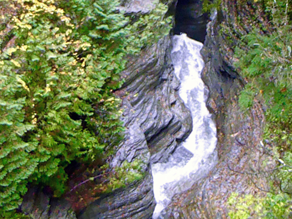 The early European settlers found the area useless for farming and called it the “Great Gully.” The Watkins family bought it and in 1830 Samuel Watkins,for whom the village and gorge are named, built a flour mill at the entrance to the gorge. He harness the water from Glen Creek into a flume and down to the lower gorge, where a water wheel provided the power to grind thousands of pounds of grain into flour in a day.