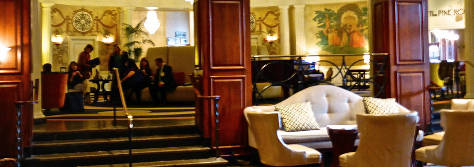 …and features marble floors, elegant chandeliers, antique lobby furnishings, and frescoes.