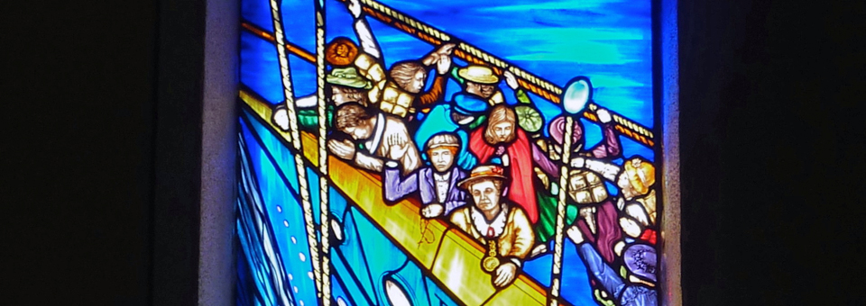 Stunning and unique stained glass windows inside the church are labeled “Emigration” and “The Titanic Rescue”.
