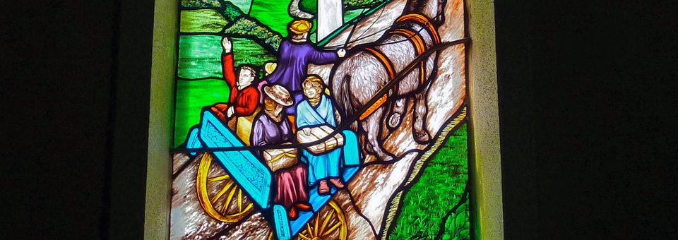 The “Emigration” window memorializes all who left Addergoole parish, wherever they settled.