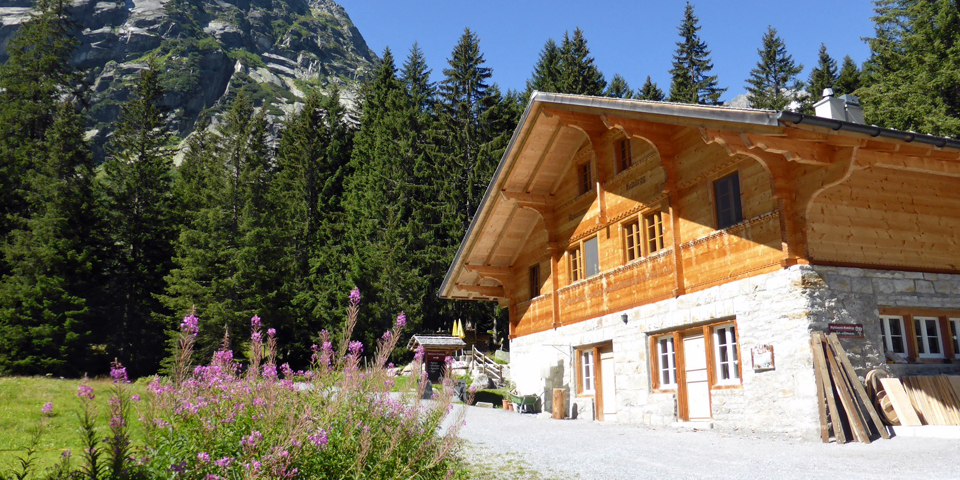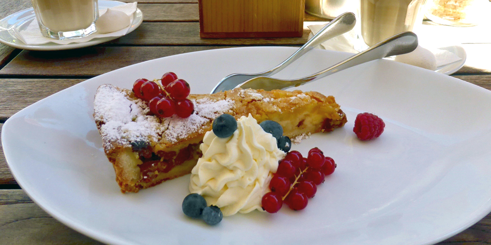Hungry after our adventure, we stopped at the Hotel Handeck, near the cheese hut and across from the bus stop. We enjoyed the apple cake served with whipped cream and berries while waiting for the next post bus back to Meiringen.