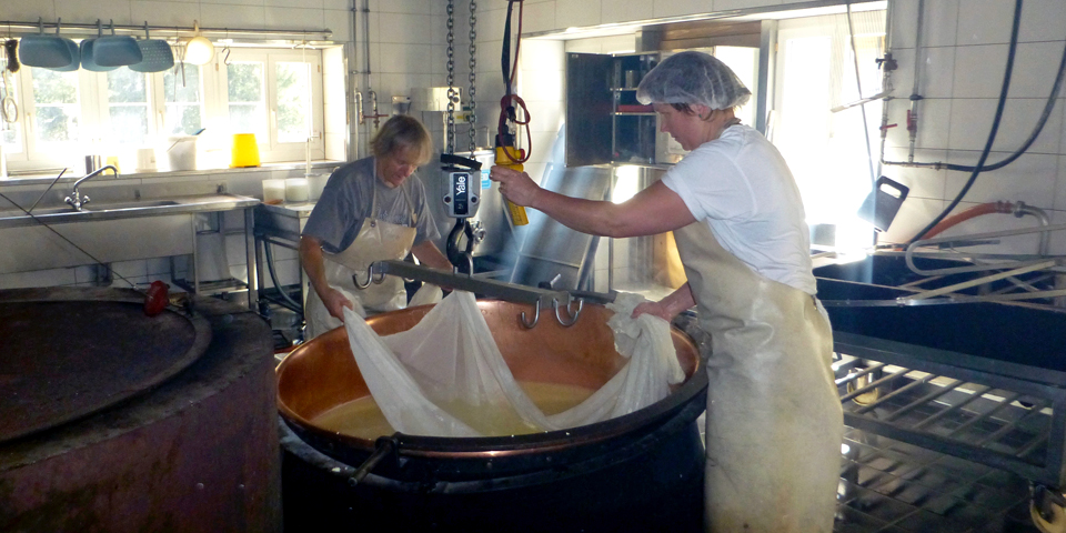 Anne (on left) and Barbara (on right) cheese making at Alpkäserei Handegg, Switzerland