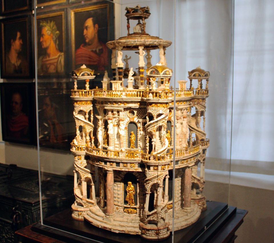 The extraordinary collection includes a palace-shaped cabinet of alabaster and marble. This safe and work of art was used to store coins, cameos, and jewelry.