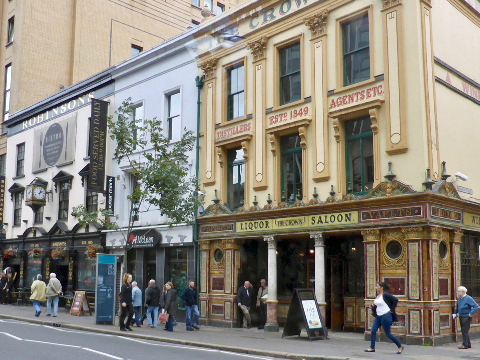 The Crown Liquor Saloon (1876) on Great Victoria Street is one of only two UK pubs owned by the National Trust. It was built as a Victorian Gin Palace with elaborate mosaic tile designs, and woodwork carved for the Titanic’s sister ship, Britannic.