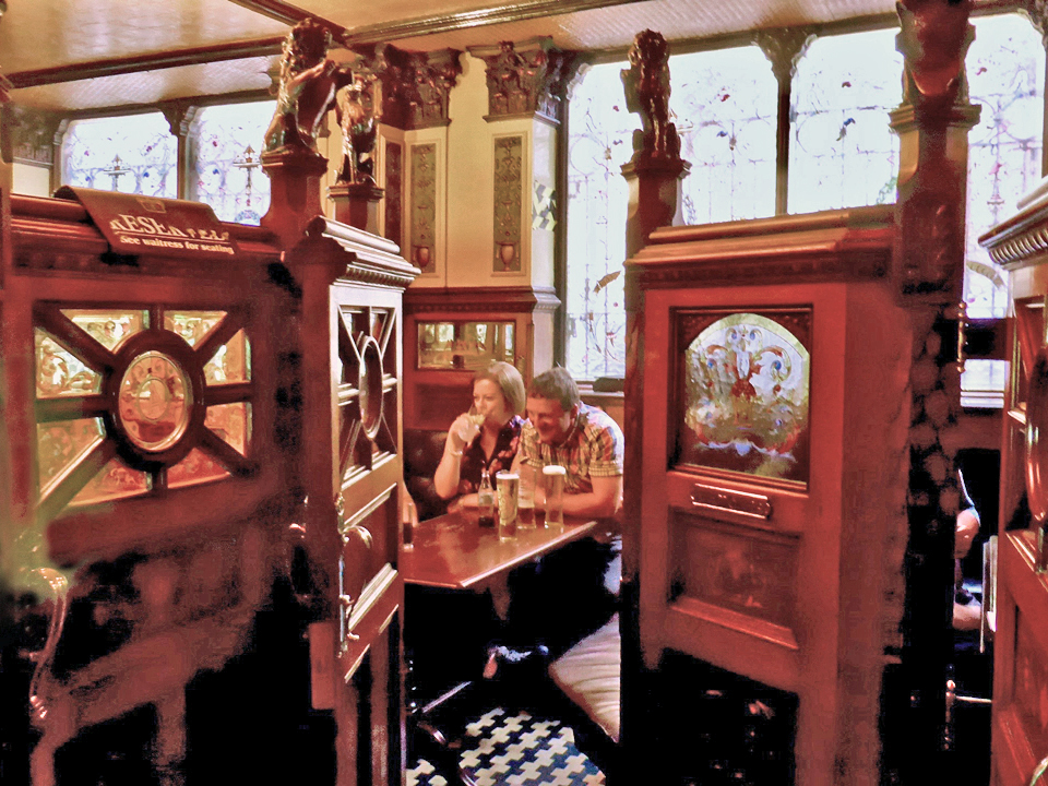 The stained glass windows and enclosed booths or “snugs” are designed for privacy and a cozt ambience.