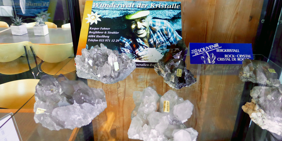A display of mountain crystal was by the entrance to the restaurant. There was also a book by Kaspar Fahner told of the wonderful world pf crystals. His Wonder of Crystals exhibit at Fahner Sport in Hasliberg features one of Europe’s top mineral collections. Entry is free when the crystal shop is open.