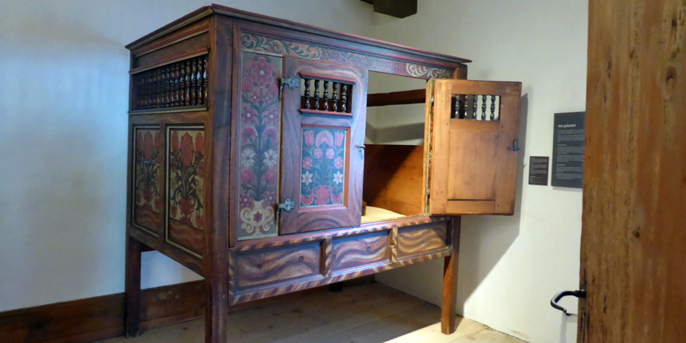 decorated bed-box, elevated and roofed to protect against vermin, Spiez Castle