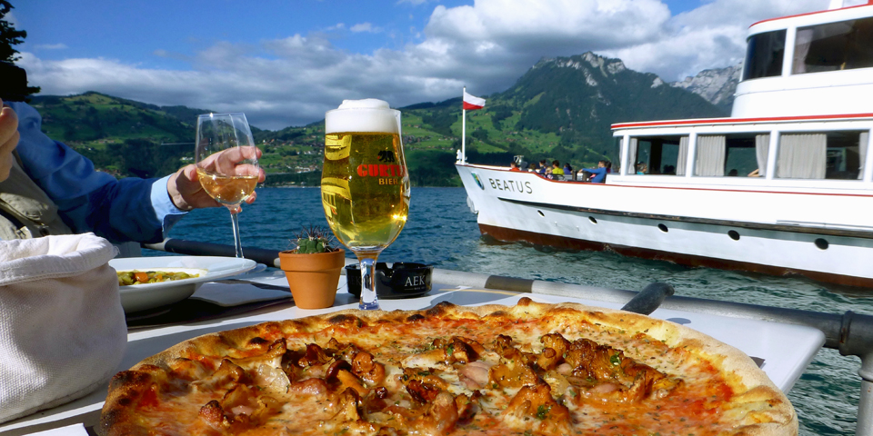 pizza with chanterelles, local wine, and beer by the boat dock in Spiez, Switzerland