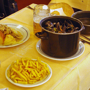 You must try one of the big pots of mosselen (mussels) in Brussels, and frites (fries), twice fried and crunchy, eaten with mayonnaise. Other specialties are tomates (shrimp stuffed tomatoes), anguilles au vert (eels in sauce), boudin (sausage) waterzooi (fish or chicken stew) and broodjes (baguettes with fillings). Buy gaufres, vanilla flavored waffles served with jam or an array of other toppings, from vendors around the Grand-Place. And don’t forget a stop at a chocolate shop for Belgian pralines!