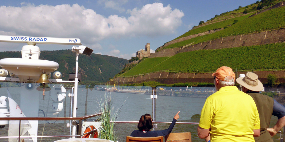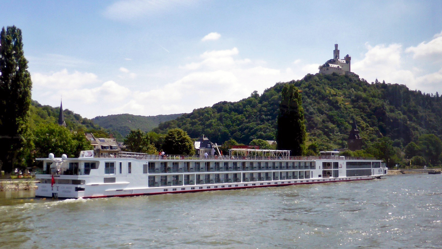 A passing Viking River Cruises’ longship during our cruise past castles of the Rhine