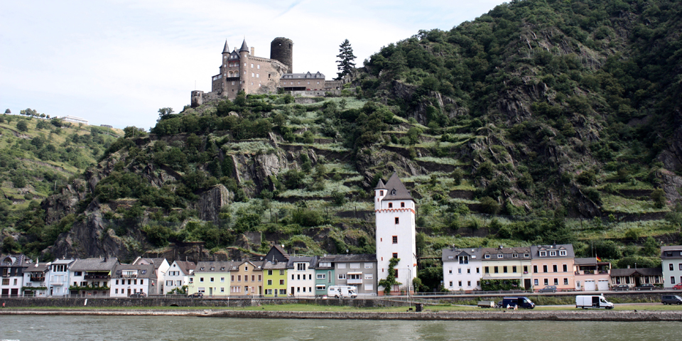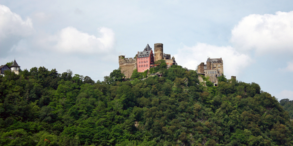 Ludwig the Bavarian built Pfalzgrafenstein Castle, “the Pfalz,” on Falkenau Island in 1327. It served as a toll station until 1866 and is now a museum. Gutenfels Castle is in the background in the fortified town of Kaub.