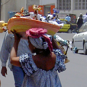 Women in brightly colored dresses balanced bowls filled with cloth dolls on their heads.