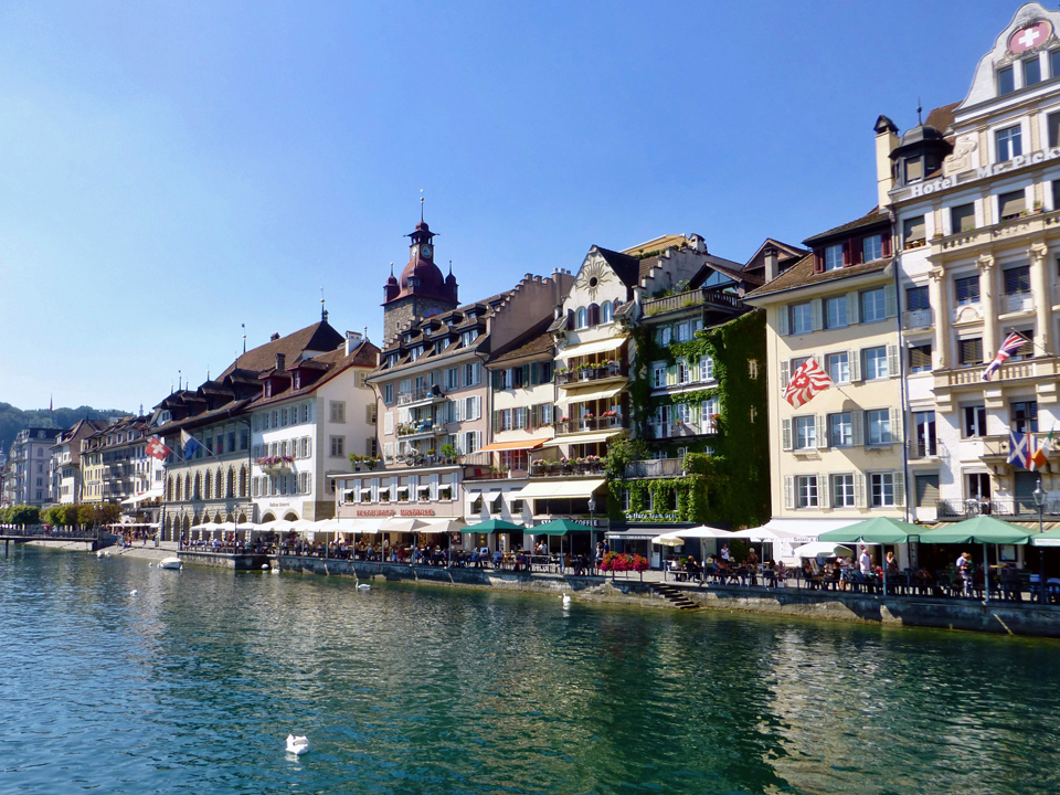 A row of restaurants in 17th century houses line the Reuss River in Lucerne.