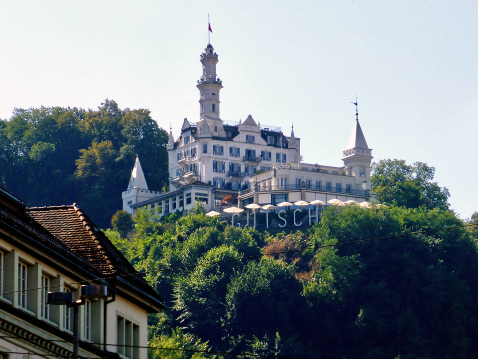 A funicular runs to the19th century Hotel Château Gütsch, inspired by the fairytale castle Neuschwanstein. The restaurant and outdoor terrace, and bar are known for the spectacular view of the city, lake and mountains. Built on the hill for English tourists it is now Russian-owned. It was rumored that Donald Trump was interested in purchasing it.