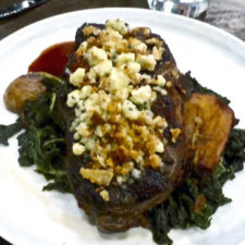 10 oz. Strip Steak with Bayley Hazen blue cheese, wilted greens, confit potatoes, and garlic croutons, Forge & Vine, Groton Inn, Groton, Massachusetts