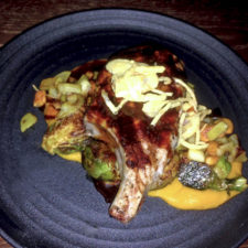 Berkshire Pork Chop, whole grain mustard jus, brussels sprouts, and sweet potato-apple hash, Forge & Vine, Groton Inn, Groton Inn, Groton, Massachusetts
