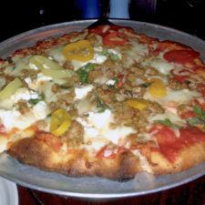 Spicy Sausage Flatbread with house-made sausage, ricotta, pickled peppers, and oregano, Forge & Vine, Groton Inn