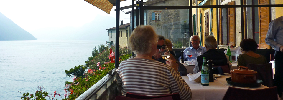 The next morning we departed for our three hour bus ride along Lake Como and the Veltlin region. A baby on board laughed heartily when the AH-OOO-GAH horn sounded on the approach to villages with streets so narrow we thought we’d scrape the sides. We stopped in Sorico, one of the Mediterranean-style Lombardy villages along Lake Como, for a break at a little ristorante and pizzeria. We continued past hillside villages and vineyards on the sunny slopes of the Veltlin valley, renowned for its fine wines.