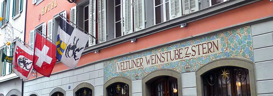 Chur enjoys 322 days of sunshine a year, but it was a rainy day when we arrived. It was a short walk past the shops and restaurants on Bahnhofstrasse to the Hotel Stern, one of our favorite Swiss hotels, owner-operated and and a documented inn since 1677. If you like, the hotel will pick you up in its 1933 vintage limousine. Located in the historic Old Town, it has wood paneling that retains the scent of the forest, warm and welcoming service, and a classic Grisonian decor. It’s the perfect place to relax. James Fenimore Cooper is but one of the notable guests.