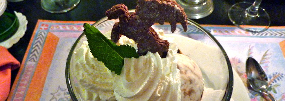 It was followed by ice cream, one with chestnuts and a warm caramel sauce, the other topped with dried plums marinated in plum brandy, each adorned with a cookie shaped like an ibex, the symbol of the canton.