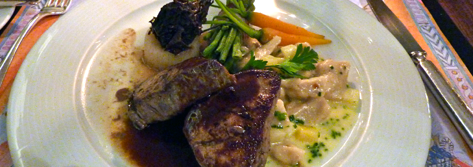 We were pleased to have a dinner reservation since the hotel’s restaurant fills quickly with guests and locals. Waitresses in dirndls serve scrumptious and artfully presented international and classic Swiss cuisine. We opted for Bündnerfleisch, which included an air-dried beef, prosciutto from the Grisons, Engadine air-dried sausage, and alpine cheese. We also tried the Chur Councilman’s Plate–veal and beef filets with Gran Alpin bizzochels, braised apple, and dried pear.