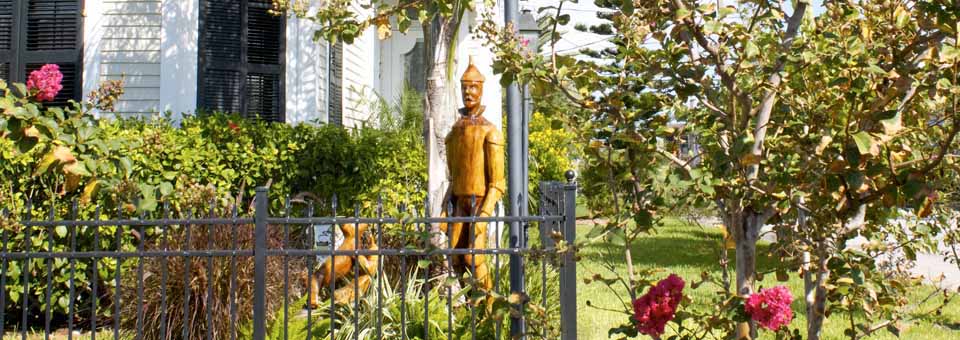 The East End Historical District has beautifully restored homes, some with hurricane-damaged trees have been carved into sculptures.