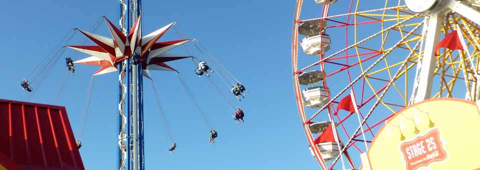There’s a 100’ Ferris Wheel, a vertical-lift steel coaster, a 200-foot-tall swing tower, midway games, live entertainment, three water playgrounds, restaurants, and shops. ($10 admission, $26.99 all day ride pass, family pricing)