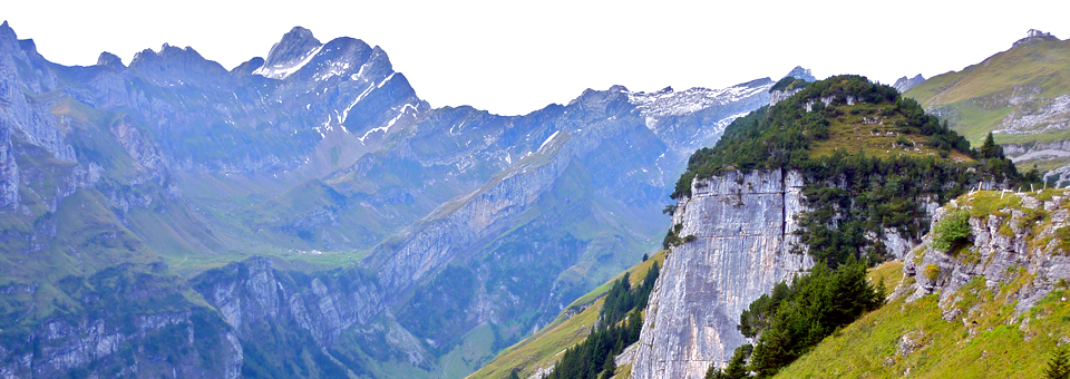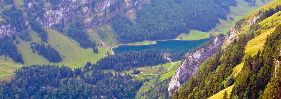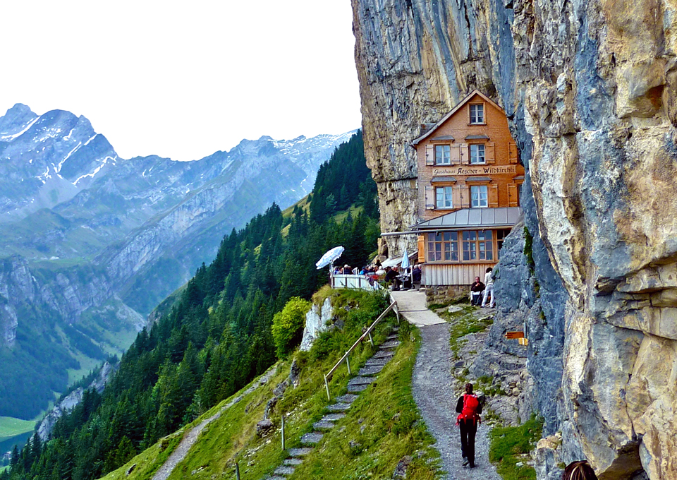 Rocky paths along steep rock cliffs lead to a prehistoric cave, a hermit’s dwelling, and a cave chapel, Wildkirchli, inhabited, at different times, by giant cave bears and hermits.