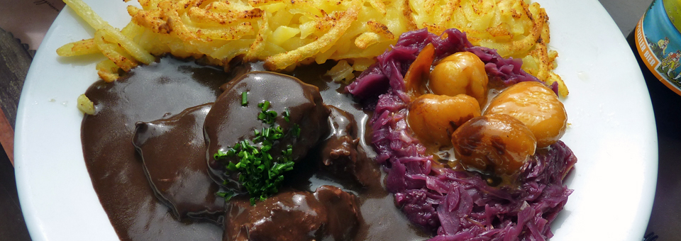 The mountain forms the back wall of the Berggasthaus Ӓescher, a restaurant and dormitory that can accommodate 45 guests. The carved wood menu includes hearty meat and rōsti (shredded potatoes with cheese) dishes.