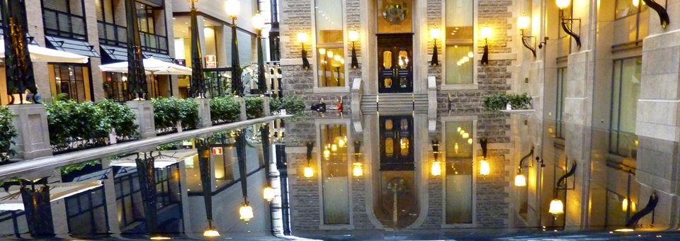 The hotel lobby led to a pedestrian passageway with trendy boutiques and lively cafés, part of a glass-roofed renovated city block that includes the World Trade Centre Montréal, Victorian Age bank and steamship company buildings, and the St. James, renowned hotel of the rich and famous. A portion of this ruelle des Fortifications, the 18th century city walls and lane, has been preserved creating a space for exhibits and receptions.