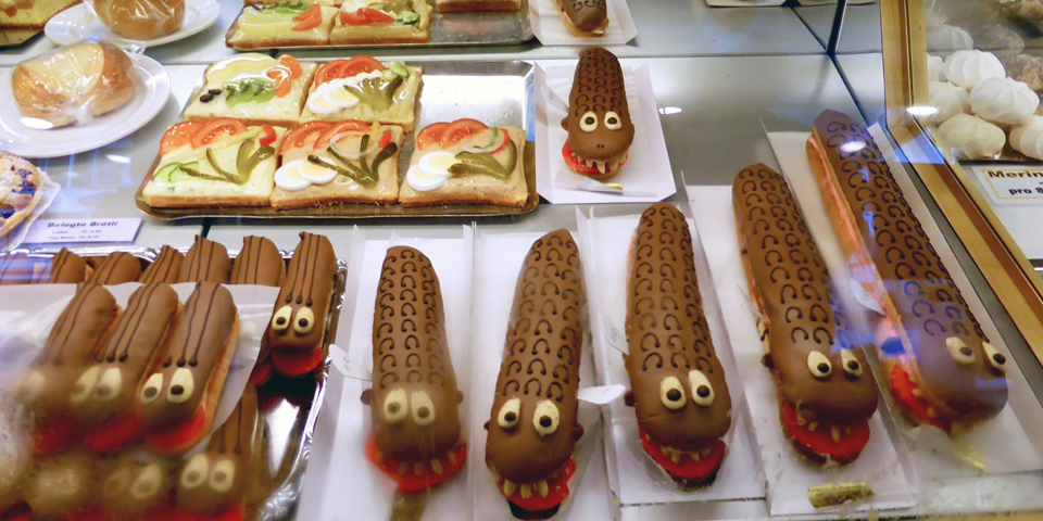 The bakery has an unusual creature emerging from its facade. Long, scaly creatures known as tatzelwurms are said to have been sighted several times in the Swiss Alps over the past few centuries.