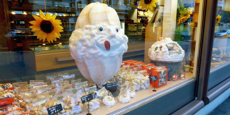 During our Untours apartment stay in the heart of Switzerland, we noted banners strung across the streets attesting to Meiringen‘s claim to being the birthplace of meringues.