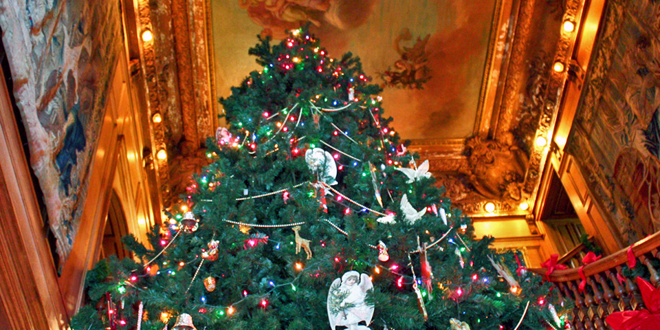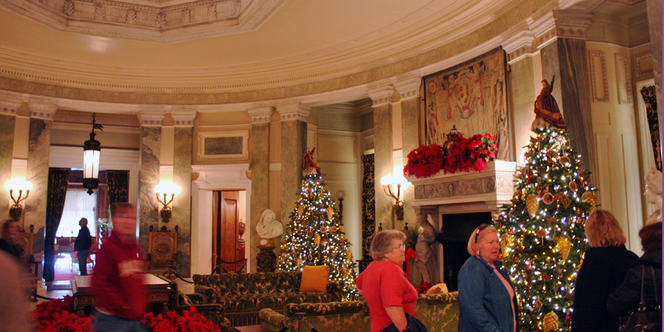A 25’ Christmas tree dominates a reception hall lined with portraits indicating Mrs. Mills’ lineage and a spectacular stairway with elaborate gilding, European tapestries, and art.