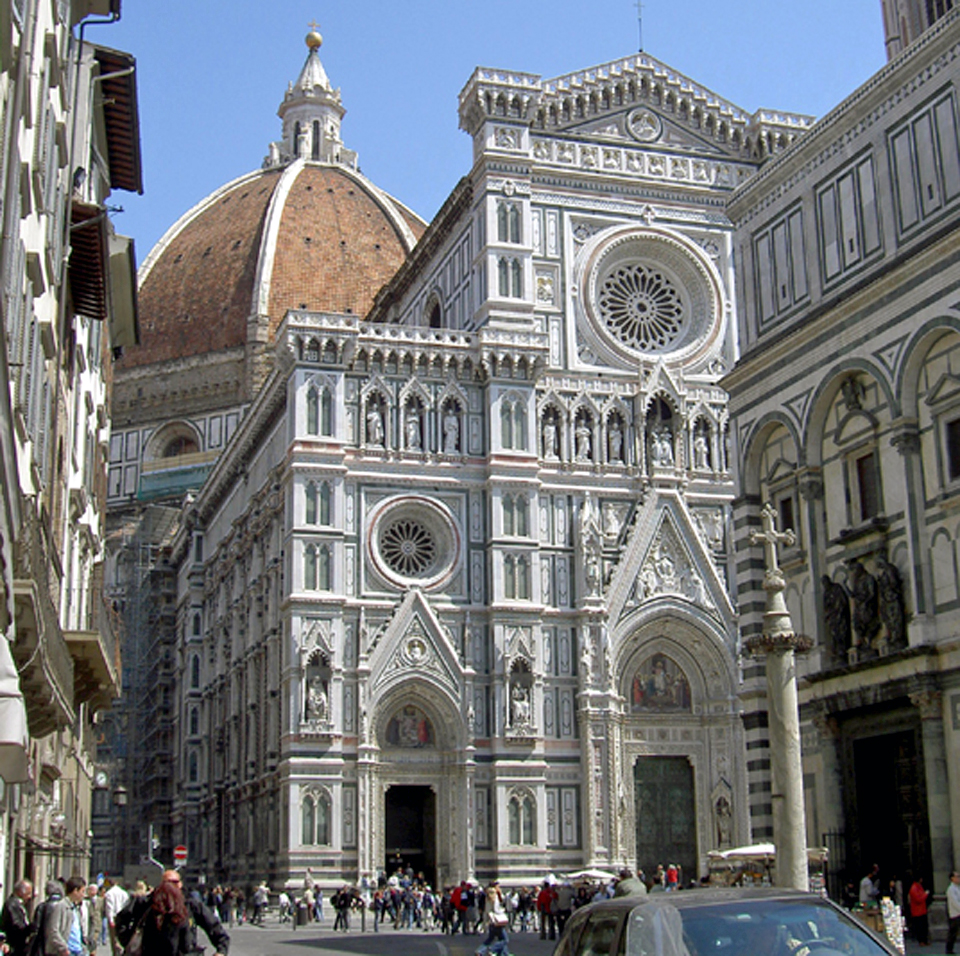 Continue on to the architecture of the Piazza del Duomo (Cathedral Square). Inspired by the dome of the Pantheon, Brunelleschi won a design competition for this landmark, built without scaffolding. The dome dominates the skyline, and some say this cathedral with a grand and ornate exterior of red, green, and white marble and modest interior was built inside out. Climb nearly 500 steps for a spectacular city view.