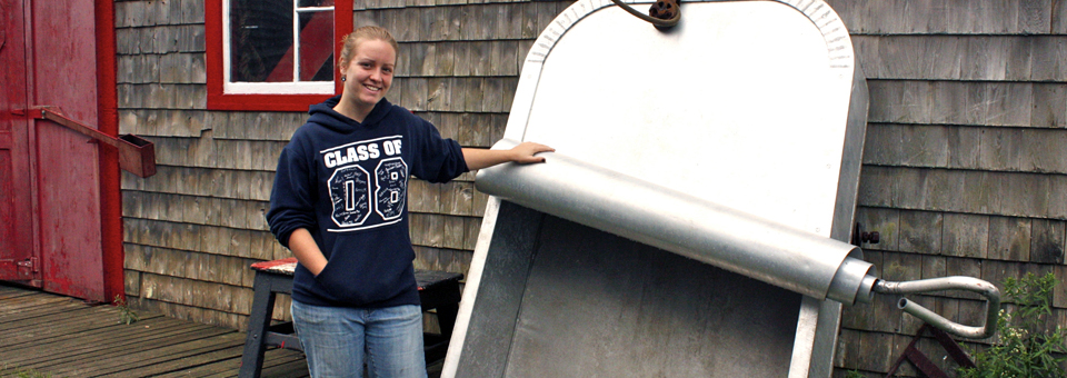Volunteer Megan Ingalls with founder Michael Zimmer’s boat, built in the shape of a sardine can, Sardine Museum and Herring Hall of Fame