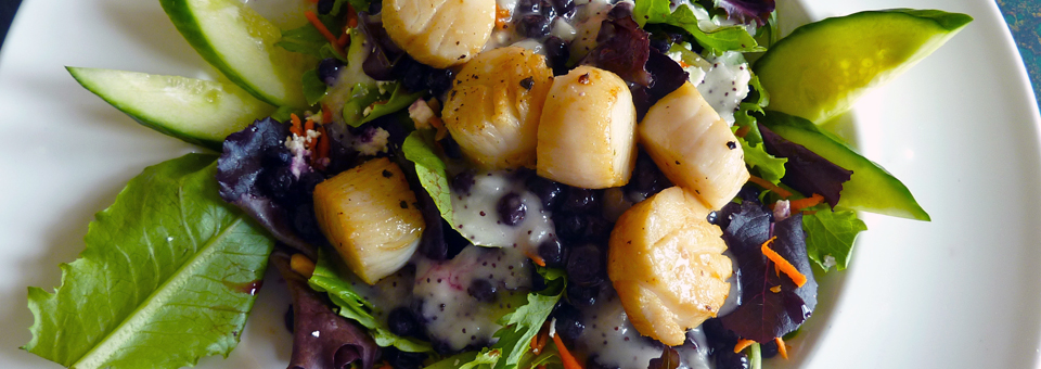 The next morning, we continued along the bay to Fundy National Park and walked a trail. We stopped for lunch in Alma, where lobster boats were idle on the ocean floor awaiting the incoming tides. Lunch at Tides Restaurant was a scrumptious salad with freshly harvested wild blueberries and scallops.