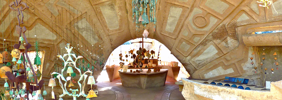 Soleri received a Ph.D with highest honors from Torino Polytechnico and was granted a fellowship with Frank Lloyd Wright at Taliesin and Taliesin West. Commissioned to build a ceramics factory in Italy, he went on to create his signature ceramic and bronze wind bells and siltcast structures. He lives at at Cosanti, also the site of his gallery and studio, in Paradise Valley, a short drive from downtown Scottsdale.