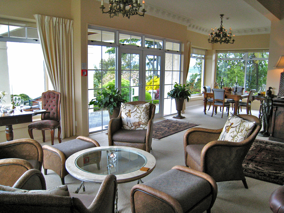 Mingle with other guests in the main dining room, or choose a private dining room, the wine cellar, the terrace, or your suite. Prince Andrew was among the recent guests. Our dining companions came from Belgium, Australia, the UK, Scandinavia, and the United States. There was also a couple from nearby Taupo celebrating a special anniversary.