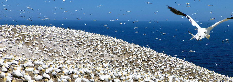Once on the island, we chatted with park ranger Carole Couet, who related colorful stories of the Northern gannet bird behavior she has observed. We hiked a wooded trail, uphill for the first part, but well worth the effort for the unparalleled spectacle–a plateau that is part of the colony of 120,000 northern gannets. It’s the largest and most accessible northern gannet colony in the world and the largest migratory bird refuge in North America.
