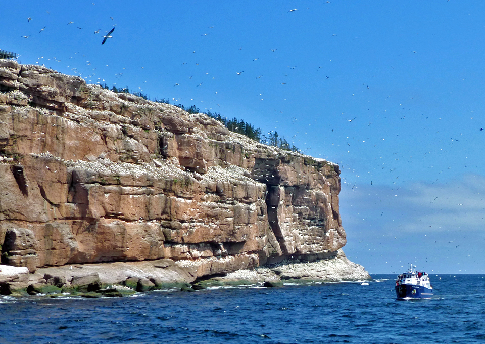 The excursion continued to Bonaventure Island, which with Percé Rock is a Canadian National Park. We spotted minke whales by watching where the seabirds were diving for fish, and were captivated as we cruised past seemingly endless swarms of sea birds on the cliffs.