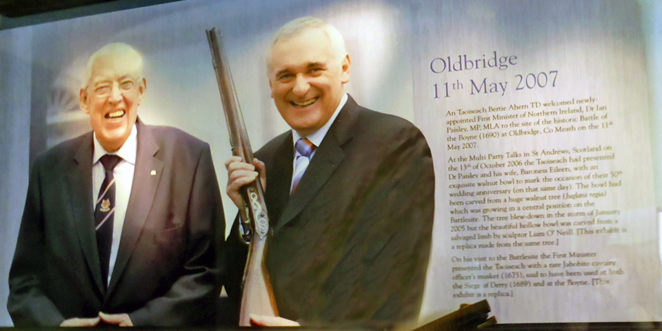 When Paisley visited the battleground in 2007 as the newly appointed First Minister of Northern Ireland he brought a rare Jacobite cavalry officer’s musket that is thought to have been used in the Battle of the Boyne as a gift. Ahern and Paisley noted the significance of these events in rebuilding relationships.